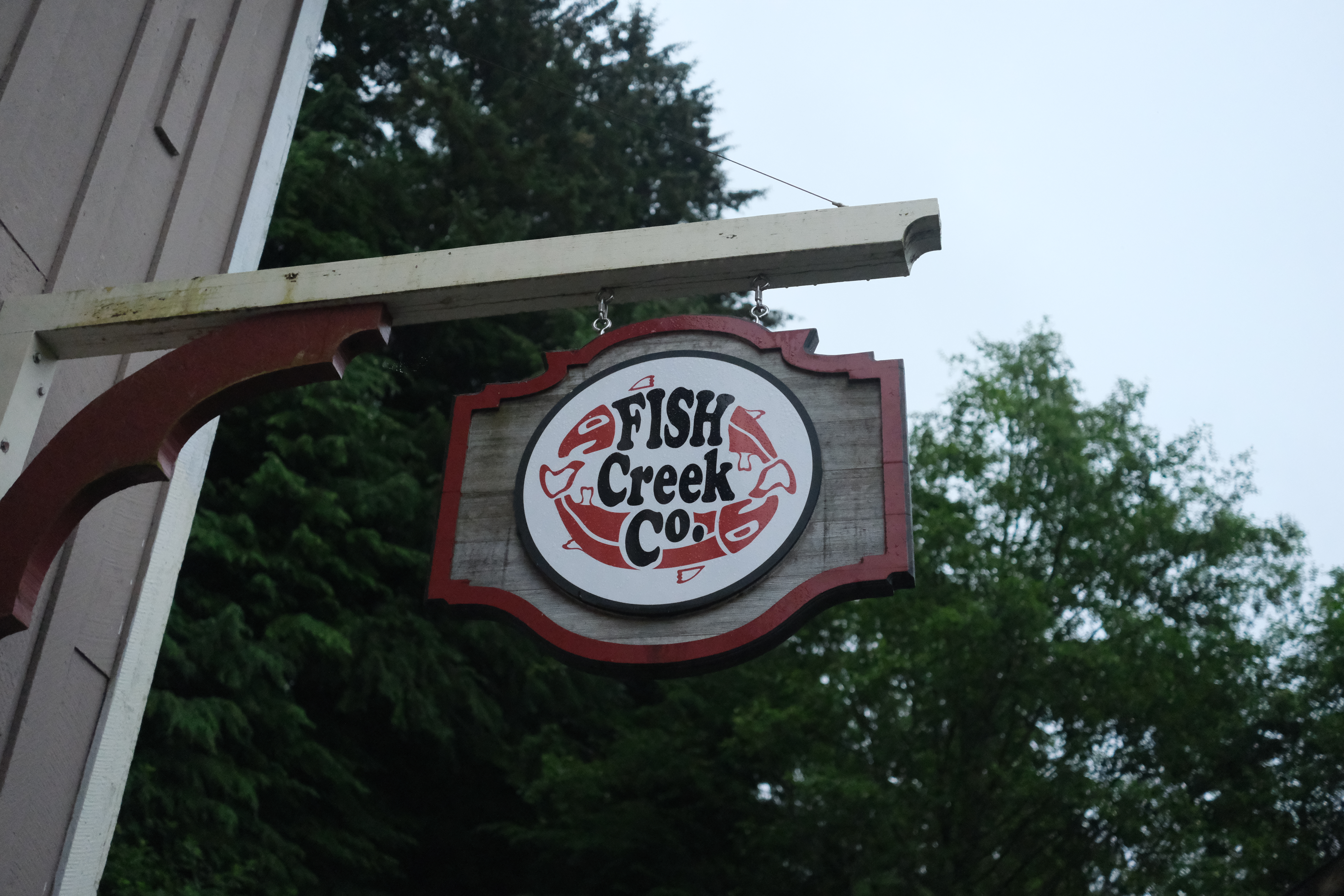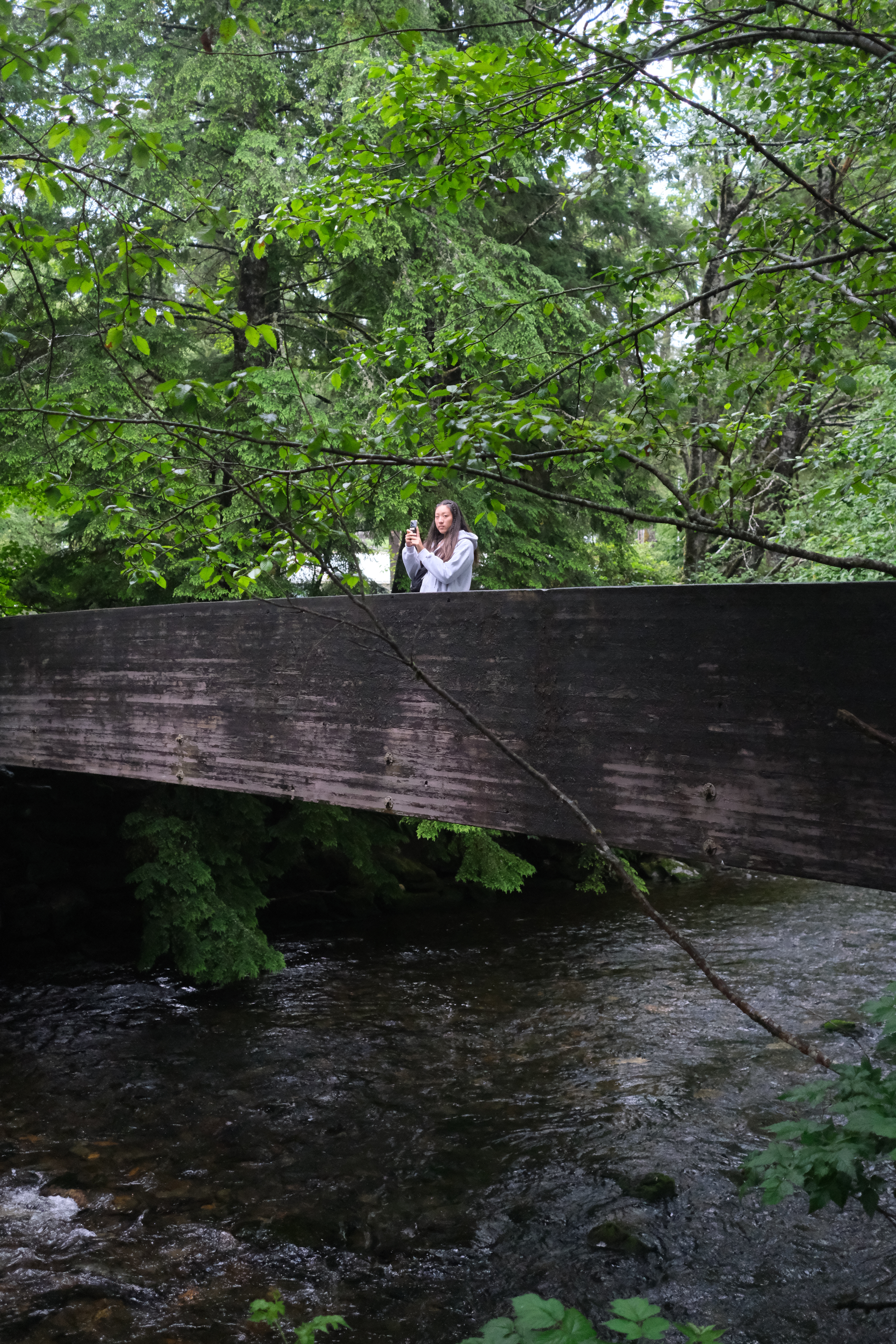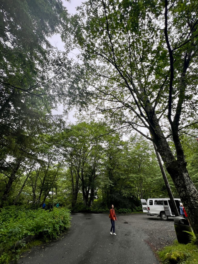 After a nice walk, we hopped on the free shuttle bus and stopped by the Totem Heritage Center. Although we didn’t go inside, we explored the area around it where the creek continued running surrounded by towering trees. We also eavesdropped on a tour group that happened to be there at the same time and learned about the journey of salmon as they make their way upstream.