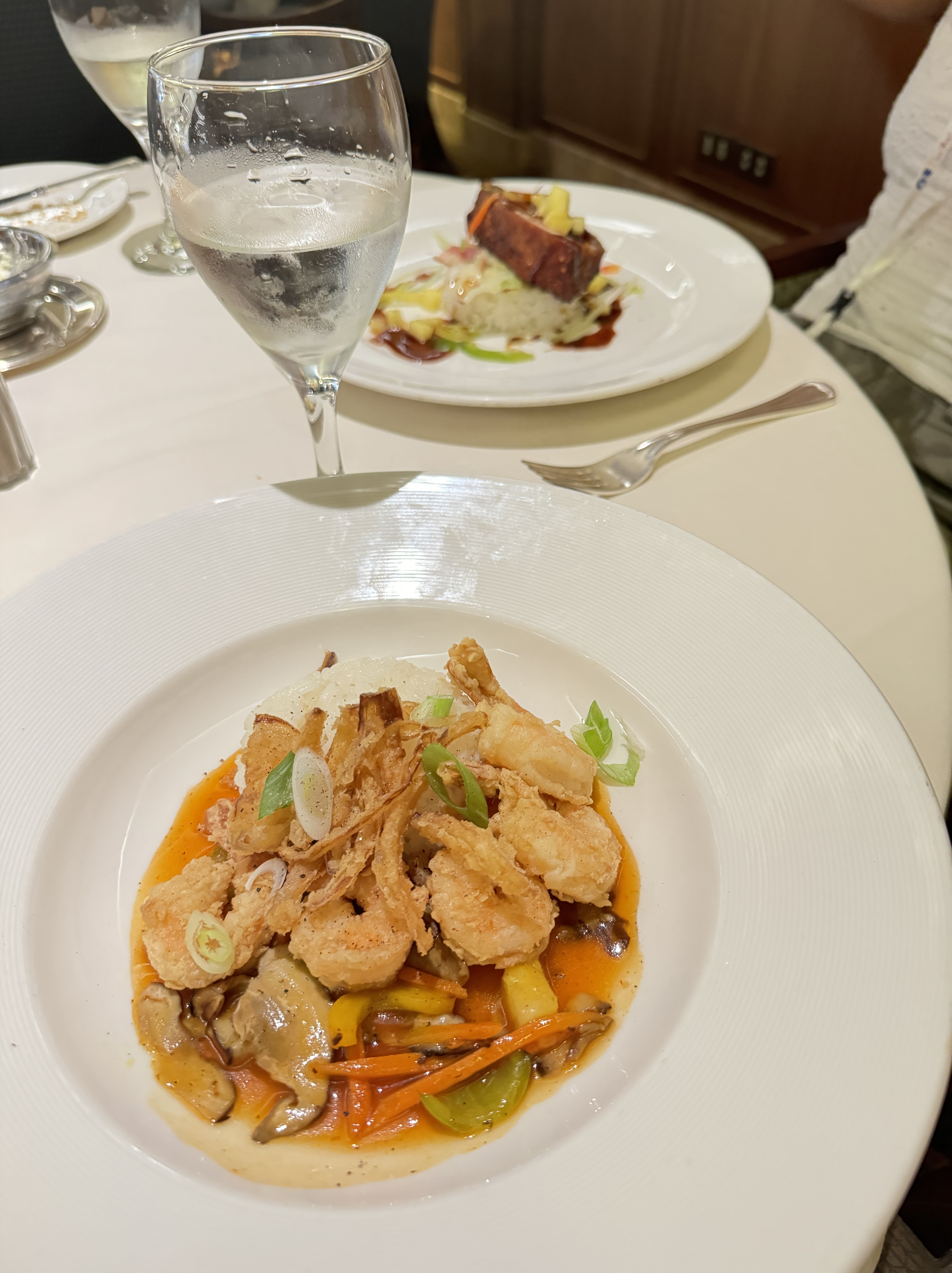 In the evening, my sister and I dressed up for dinner and went to one of the three main dining rooms. The elegant atmosphere, with its crisp linens, attentive service, and meticulous culinary presentations, was like dining at a top-tier restaurant.